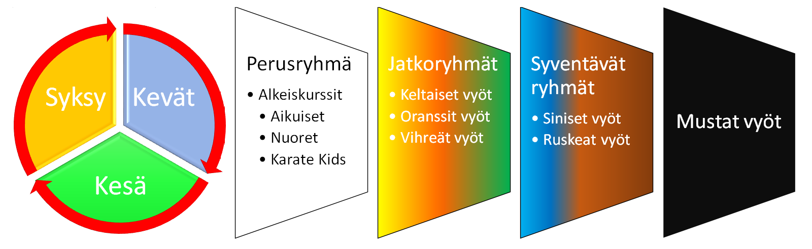 Kaikki voivat halutessaan osallistua muidenkin ryhmien harjoituksiin, esim. keltaiset vyöt voivat osallistua myös seuraaviin ryhmiin. Huomioithan kuitenkin ryhmien yleisen tason ja etenemisvauhdin tässä tapauksessa!