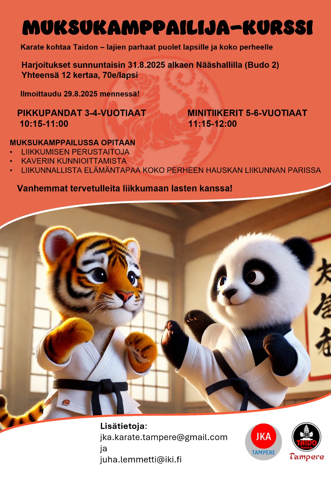Tervetuloa mukaan jälleen yhteiselle karaten ja taidon kurssille, joka on suunniteltu perheen pienimmille! Kurssilla opitaan ensisijaisesti monipuolisia liikkumisen taitoja leikin varjolla, ja tuodaan ikätasoisesti lasten harjoitteluun soveltuvia osia kummastakin kamppailulajista. Kurssilla harjoitellaan myös kamppailulajeihin kuuluvia perusasioita, kuten keskittymistä, kaverin kunnioittamista, sekä kohteliasta käytöstä.